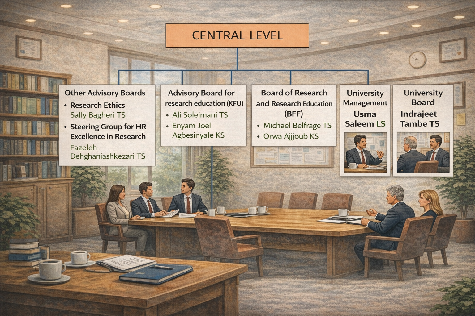 The Vice-Chancellor decides the mandate and composition of two different preparatory committees at the university. The Preparatory Committee for Education/Kommittén för forskarutbildning (KFU) prepares decisions on matters affecting all of the university’s educational programmes. The Preparatory Committee for Research and Doctoral Education/Beredningen för forskning och forskarutbildning (BFF) instead handles matters relating to research and doctoral education at the university.